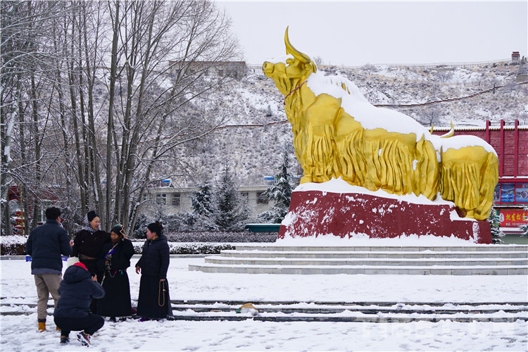第二站,銅牛廣場(chǎng)。銅牛廣場(chǎng)位于布達(dá)拉宮西南方向約300米處,北京中路與林廓西路在此相交。這里是開放式的人行道,非常開闊,是通往布達(dá)拉宮廣場(chǎng)的必經(jīng)之路,很多人都在此合影留念。雪中的銅牛披上了白色的“外衣”,更加體現(xiàn)出“憨厚、忠誠(chéng)、悲憫、堅(jiān)韌、勇悍、盡命”的牦牛精神。