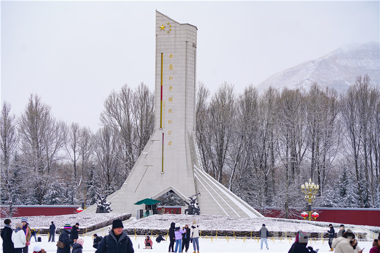 圖為雪中的西藏和平解放紀(jì)念碑 攝影:趙振宇