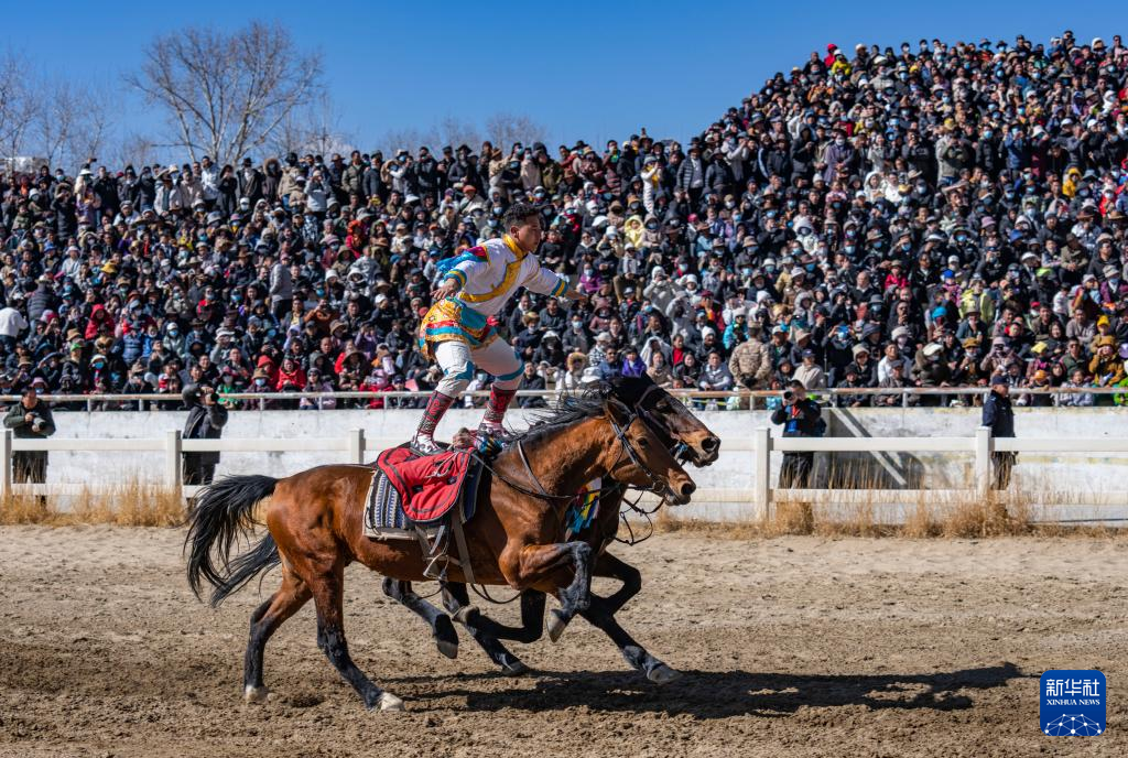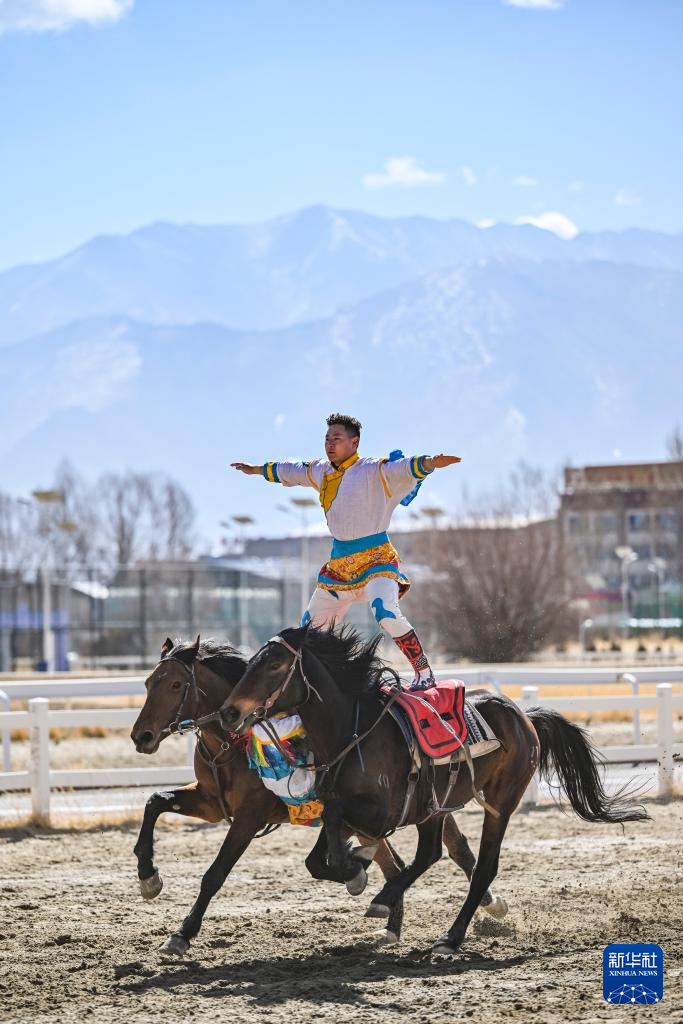 在拉薩賽馬場,騎手進行雙馬單人表演(2月12日攝)。新華社記者 孫瑞博 攝 ??
