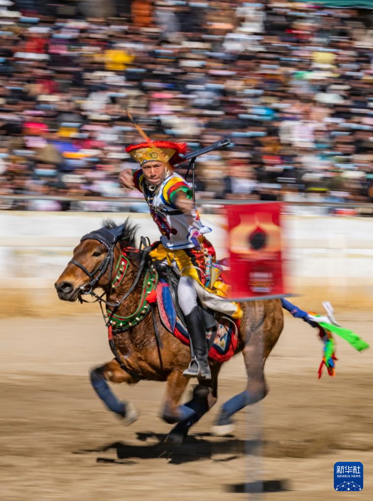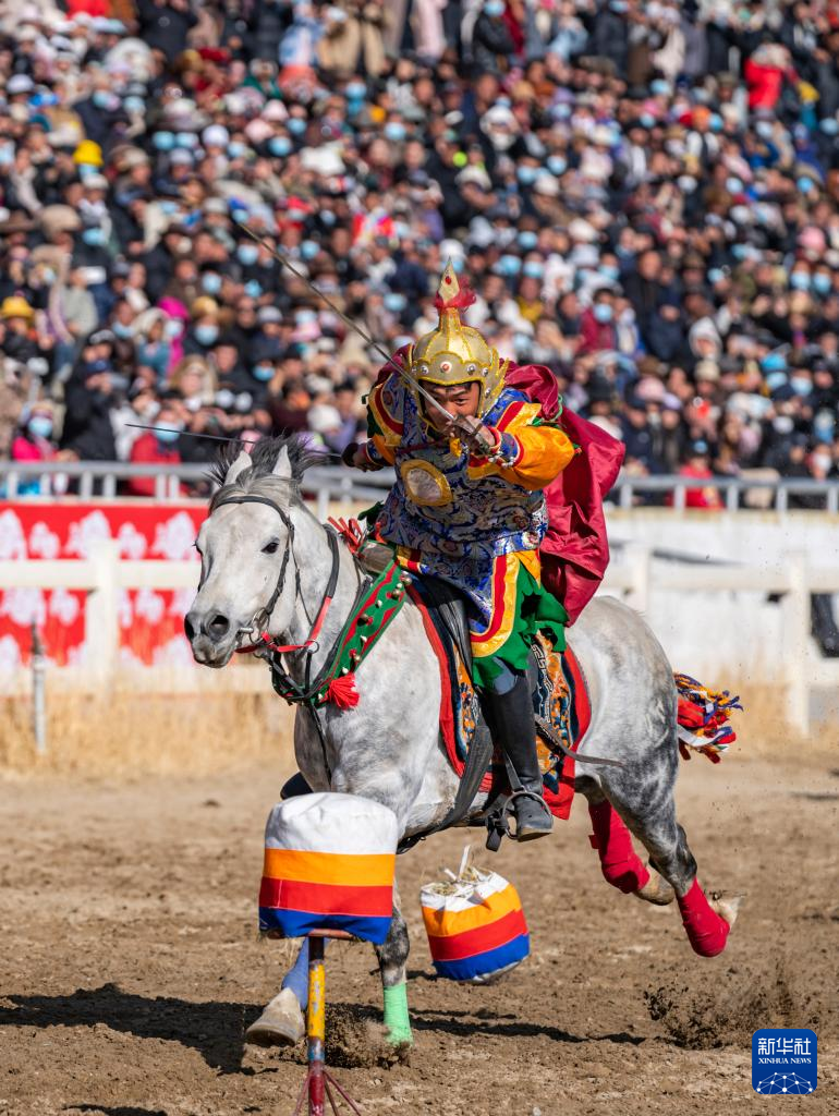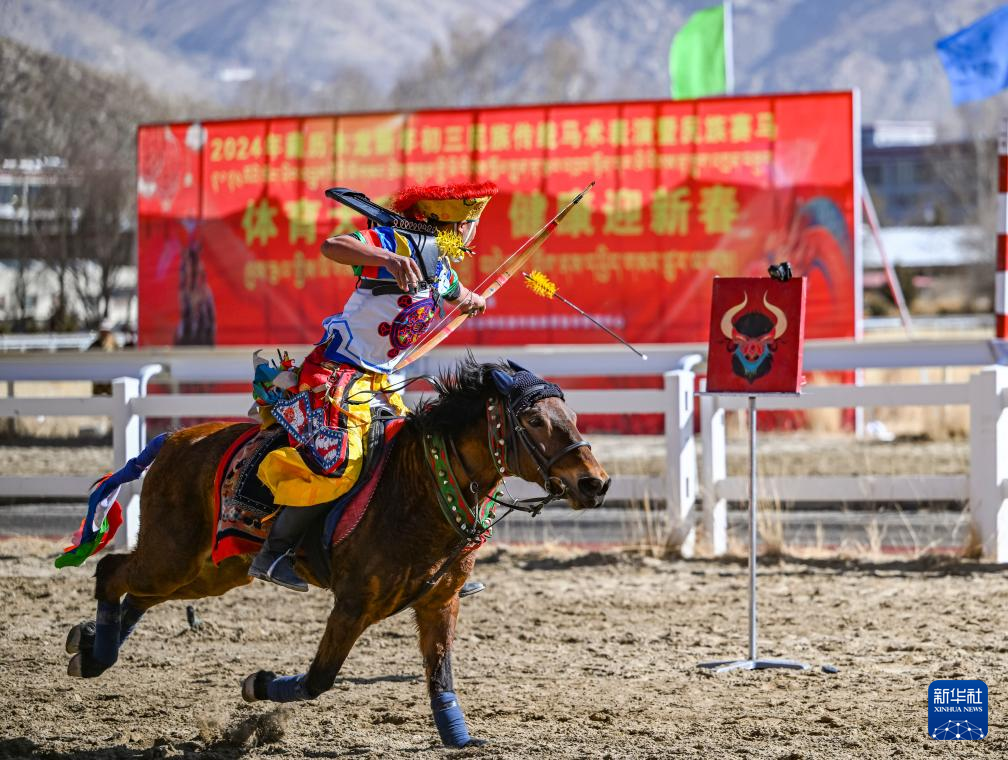 在拉薩賽馬場,騎手表演馬上射箭(2月12日攝)。新華社記者 孫非 攝 ??