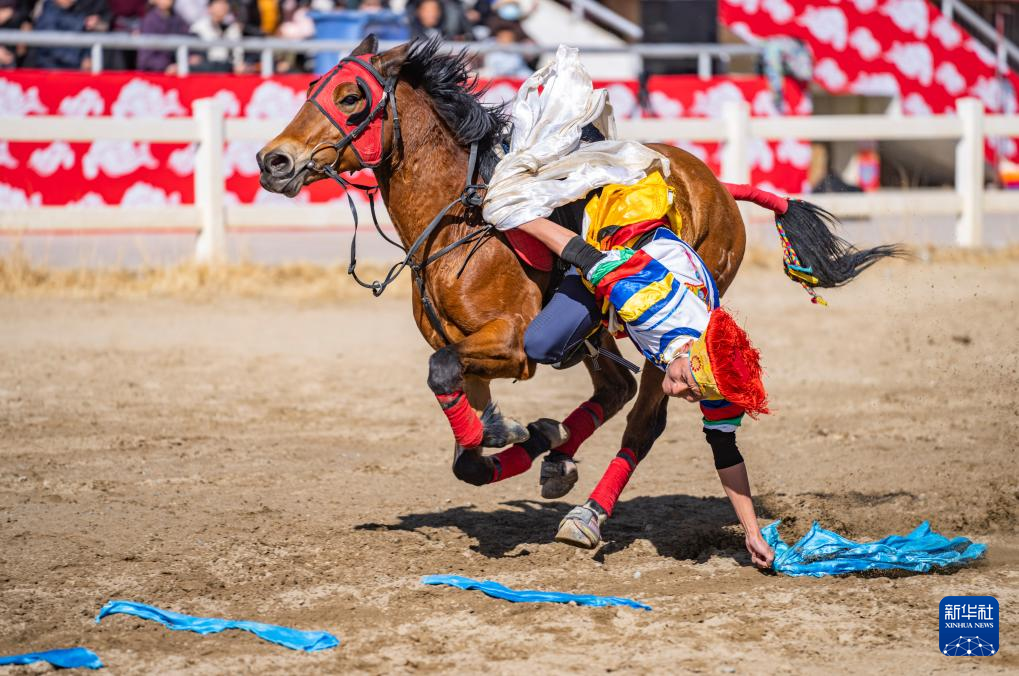 在拉薩賽馬場,騎手表演馬上拾哈達(2月12日攝)。新華社記者 孫非 攝 ??