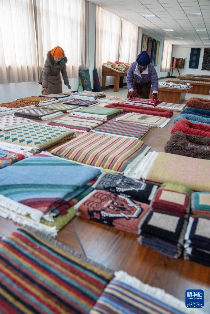 兩名婦女在展示自己編織的藏毯(2月22日攝)。新華社記者 旦增尼瑪曲珠 攝