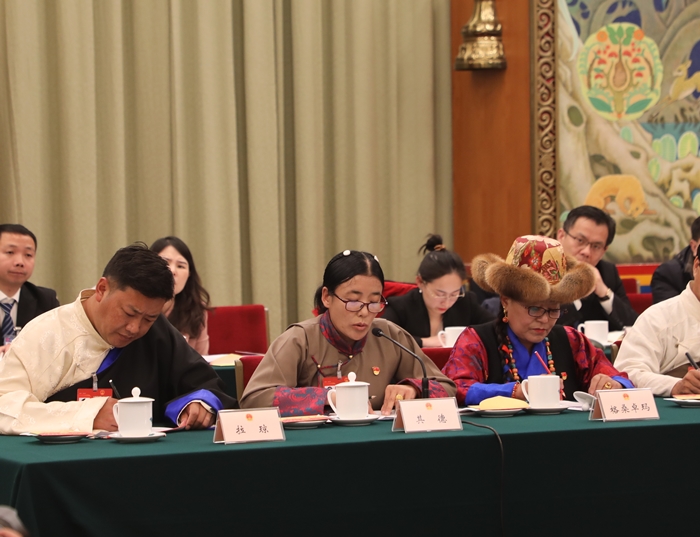 圖為其德在十四屆全國人大二次會議西藏代表團開放團組會議上發(fā)言攝影:桑吉