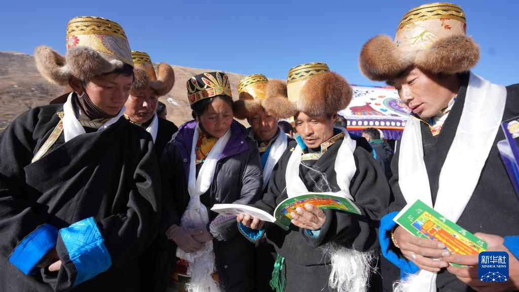 唐加鄉(xiāng)村民在達(dá)布天文觀測臺旁翻看2024年藏歷(3月9日攝)。(次昂玉珍 攝)