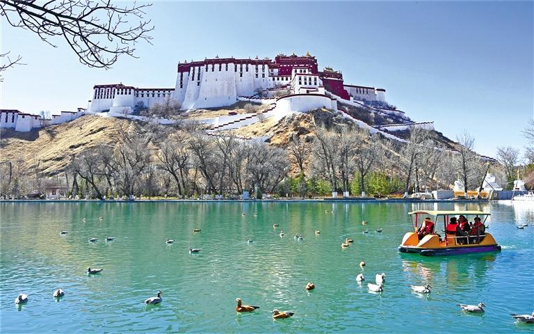 從宗角祿康公園拍攝的春日布達拉宮一角。新華社記者 丁增尼達 攝