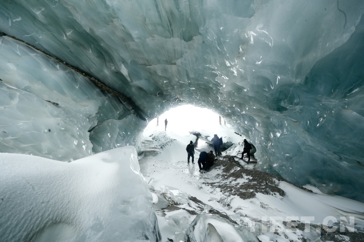 圖為工作人員在然普冰洞內(nèi)部進(jìn)行勘測。攝影:斯郎曲平