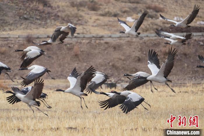 圖為黑頸鶴在林周縣境內(nèi)的農(nóng)田里覓食、嬉戲。貢嘎來松 攝