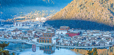 扎西崗,藏語意為“吉祥之地”。這座村莊依山而建,閣樓錯落有致,閣樓四周芳草青青、小溪潺潺,村后的魯朗林海林木蔥蘢,濃濃的綠意中夾雜著簇簇粉紅。扎西崗村與南迦巴瓦峰、色季拉國家森林公園、魯朗林海等多個景區(qū)相鄰,下轄的兩個自然村坐落于高山峽谷間,清澈的魯朗河從村前流過,向東匯入雅魯藏布江。目前,這里67戶人家中有51戶開辦了家庭旅館。民族特色建筑仿佛彩色積木,別具一格,高原田園風光因時而異,吸引了大量游客前來。