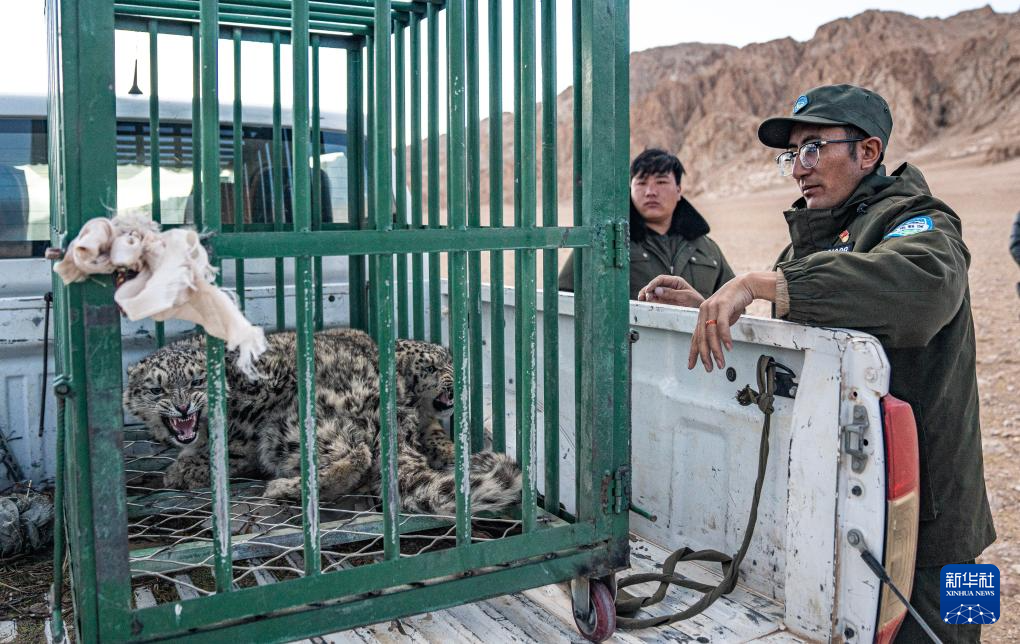 尼瑪縣野生動物管護(hù)隊(duì)員在運(yùn)送即將放歸自然的雪豹(5月13日攝)。新華社記者 丁增尼達(dá) 攝