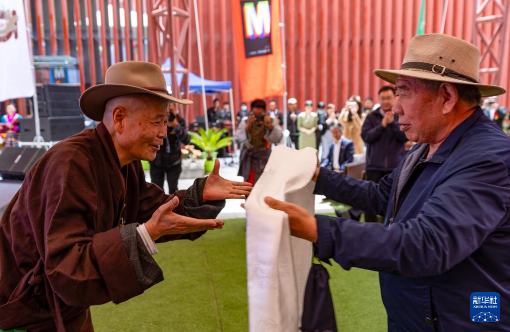 5月18日,友人為吳雨初(左)獻上哈達。新華社記者 姜帆 攝