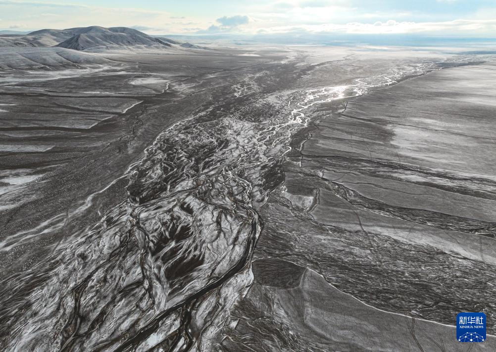 藏羚羊排隊走過甜水河河床,留下整齊的印跡(6月15日攝,無人機照片)。新華社記者 晉美多吉 攝