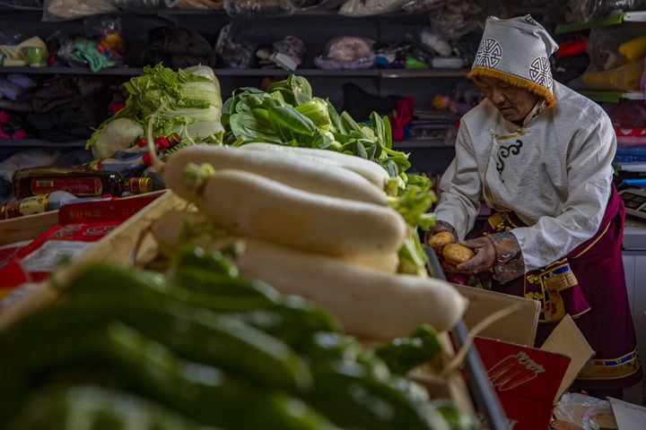 在西藏那曲市申扎縣馬躍鄉(xiāng)貝嘎四村偏遠鄉(xiāng)鎮(zhèn)果蔬配送試點項目直銷點,店主西熱加措在整理供銷合作社配送來的新鮮蔬菜(2024年1月5日攝)。新華社記者 姜帆 攝