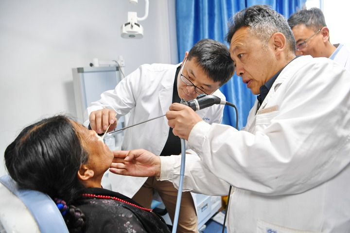 中國醫(yī)學(xué)科學(xué)院整形外科醫(yī)院王克明博士(左后)和西藏自治區(qū)人民醫(yī)院巴羅主任(右前)為患者查體(2024年8月27日攝)。新華社記者 張汝鋒 攝