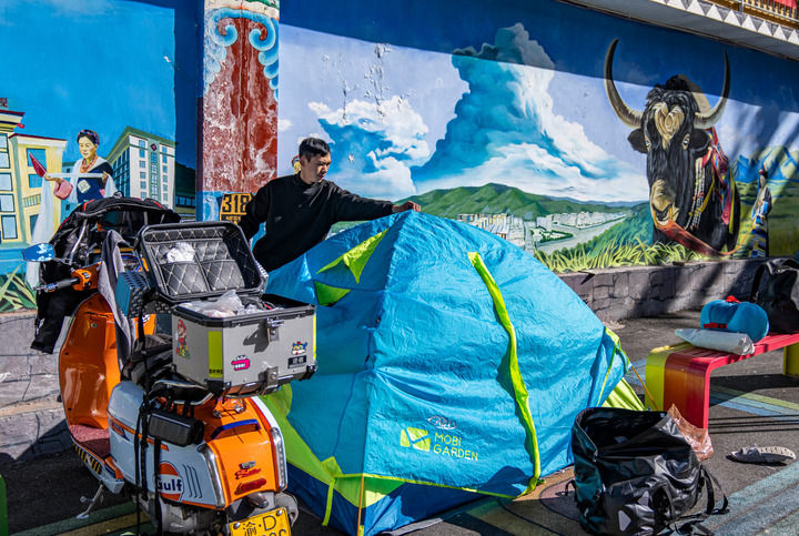 經(jīng)國道318線前往西藏旅游的重慶游客張靜在芒康縣如美鎮(zhèn)拉烏村整理帳篷(2023年10月20日攝)。新華社記者 孫非 攝