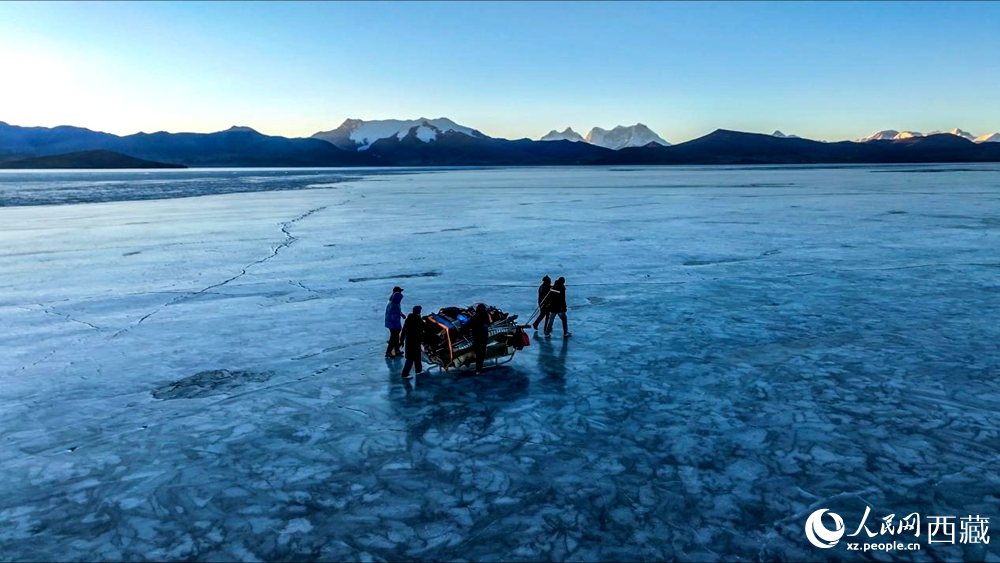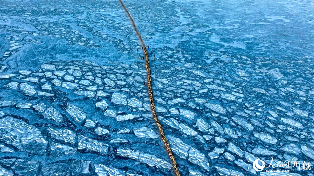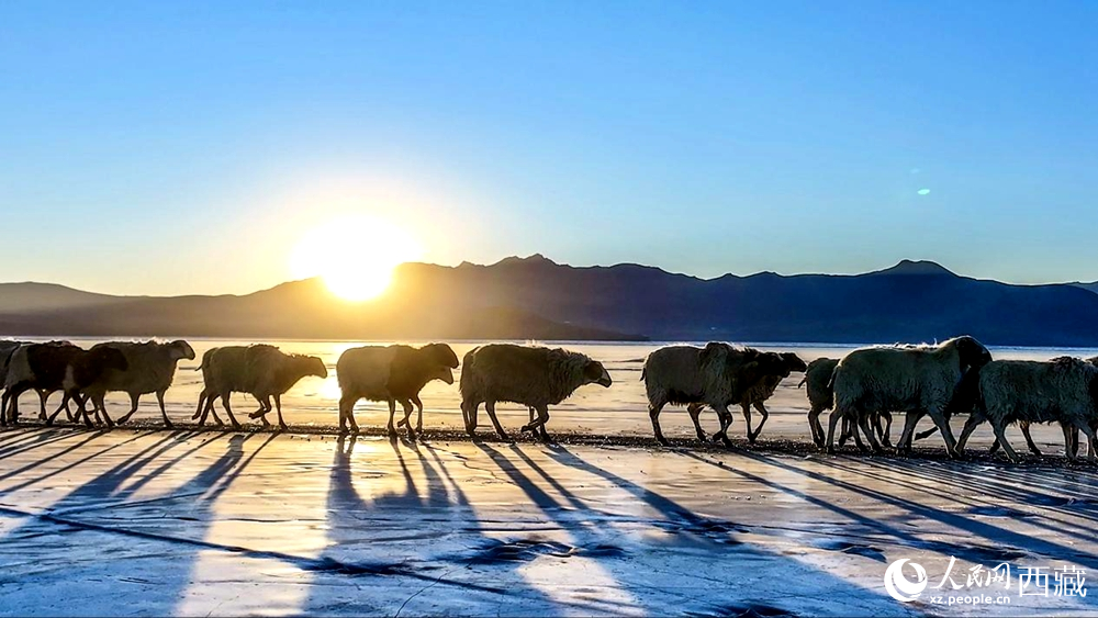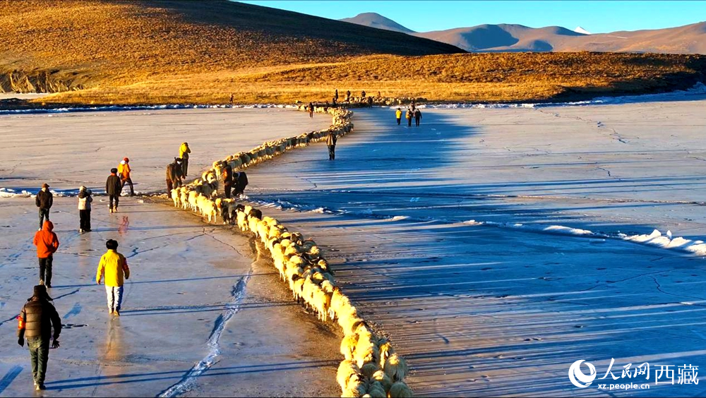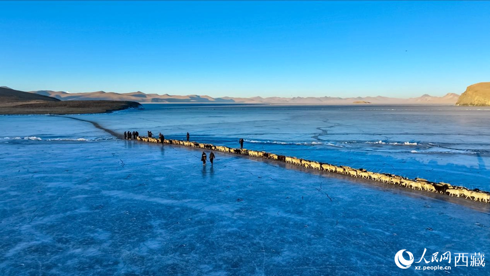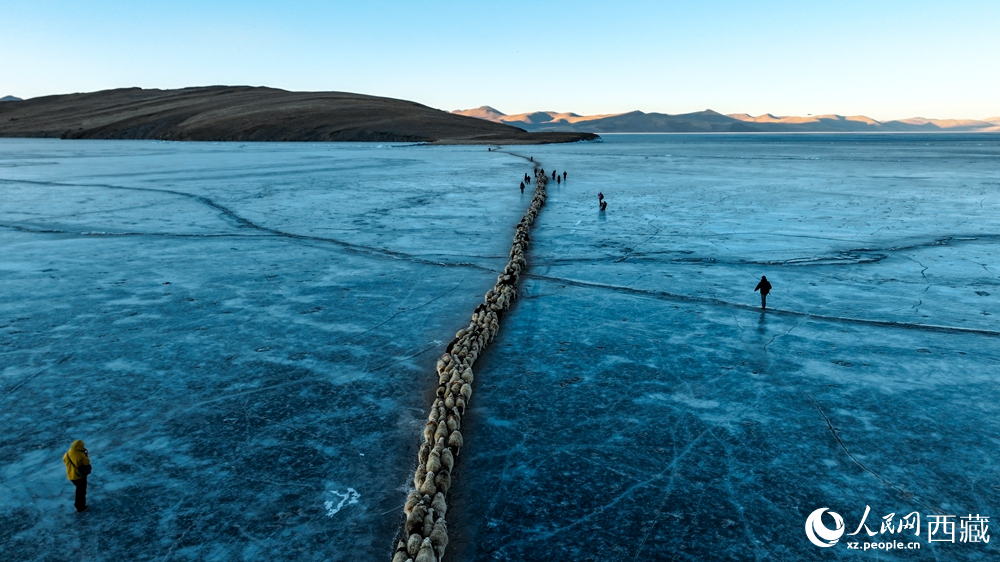 隨著一聲號令,牧民們驅(qū)趕著羊群,踏上冰封的湖面。遠遠望去,羊群如同一串串黑白相間的珍珠,在湛藍的冰面上緩緩移動,構(gòu)成一幅壯美的高原畫卷。