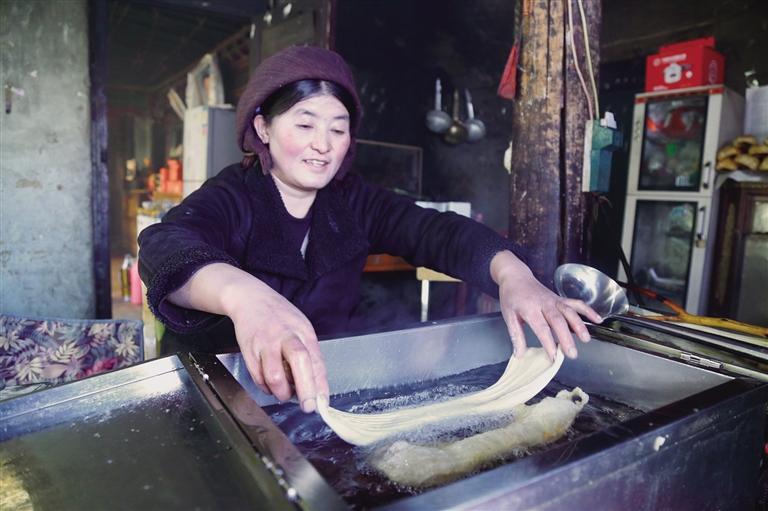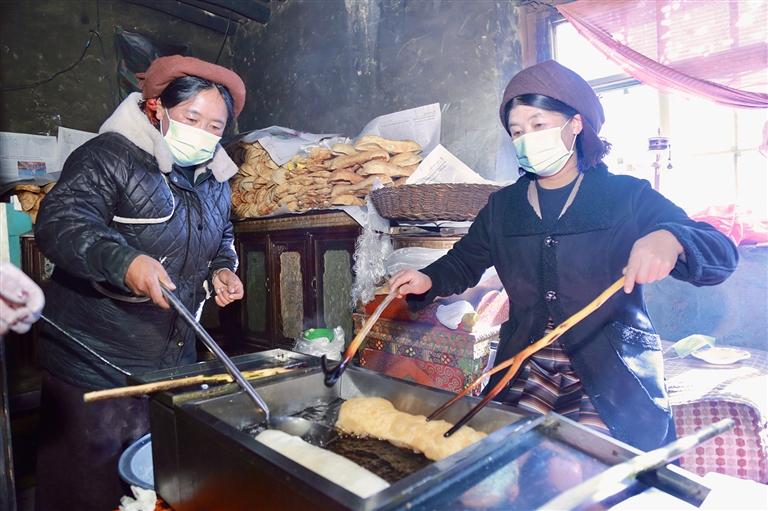 “德卡”,作為傳統(tǒng)藏式點心“卡塞”的一種,在藏歷新年的年貨清單里占據(jù)著不可或缺的位置。每到藏歷新年前夕,旦索朗一家便進入了一年中最忙碌的時段——經(jīng)營起制作和售賣卡塞的生意。旦索朗回憶起小時候的新年,感慨萬分:“小時候過年,家家戶戶都自己炸卡塞,那時候,整個村子都被卡塞的濃香包圍著?,F(xiàn)在生活條件好了,很多人覺得在外購買德卡更方便省事,這也給我們帶來了商機。我們做炸德卡的生意已經(jīng)6年了,一直都很受歡迎,還帶動了6名村民一起參與,增加了大家的收入。”