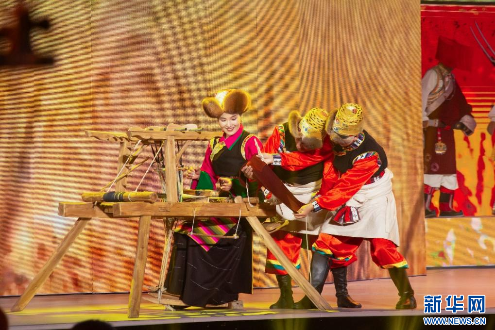 拉薩市2025年春節(jié)藏歷“木蛇”新年聯(lián)歡會(huì)錄制現(xiàn)場,演員在表演藏式織布技藝(2月14日攝)。新華網(wǎng)發(fā) 龍杰明 攝