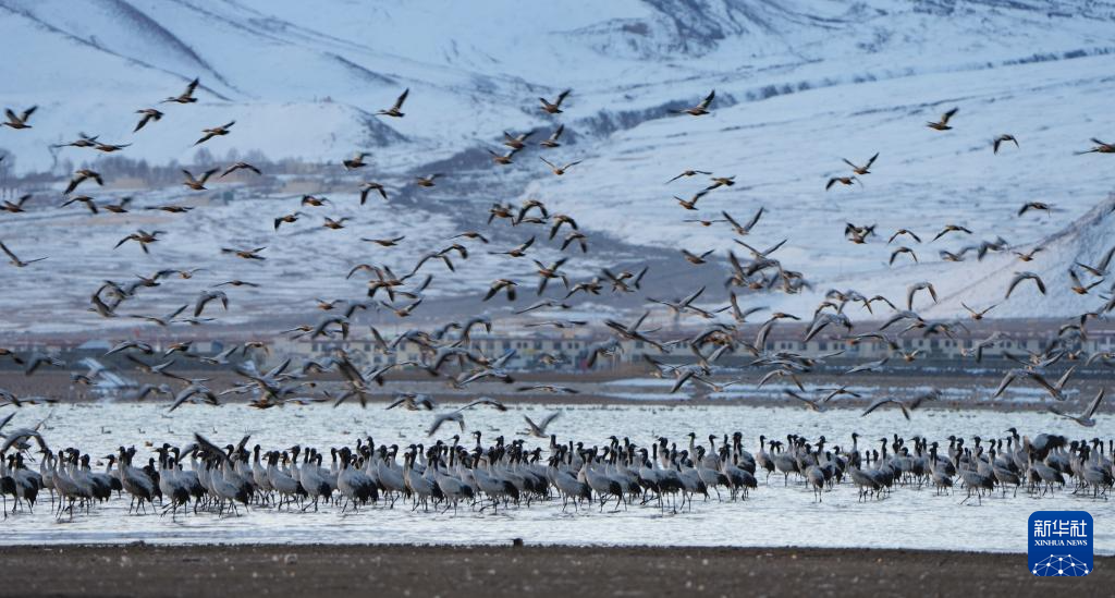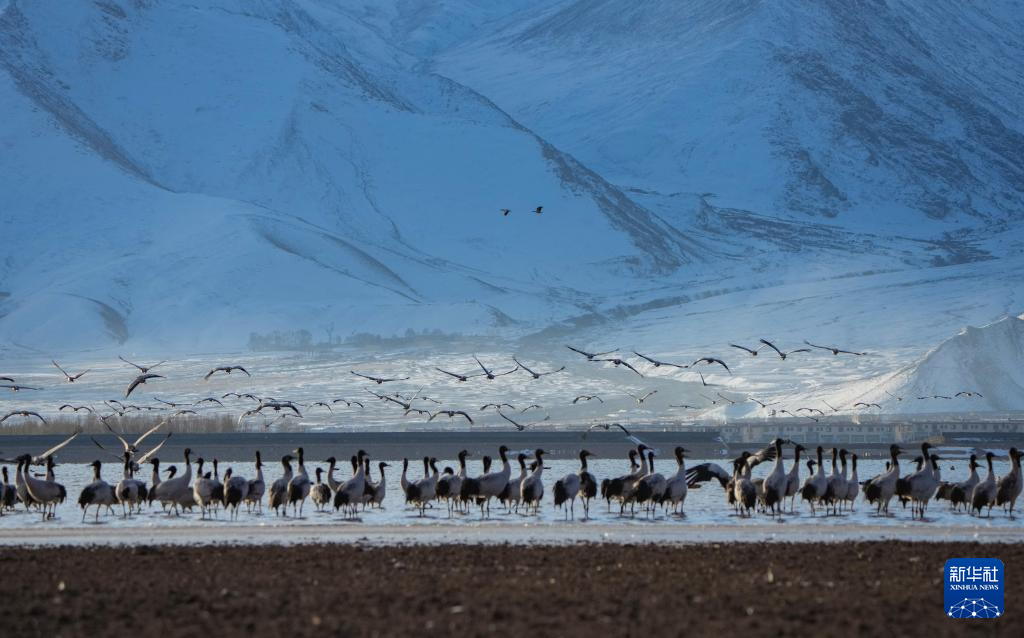 西藏自治區(qū)拉薩市林周縣平均海拔約4200米,是黑頸鶴的主要越冬地之一。一場冬雪,將林周縣虎頭山水庫染成一片銀白,黑頸鶴仿佛是這潔白舞臺優(yōu)雅的舞者。