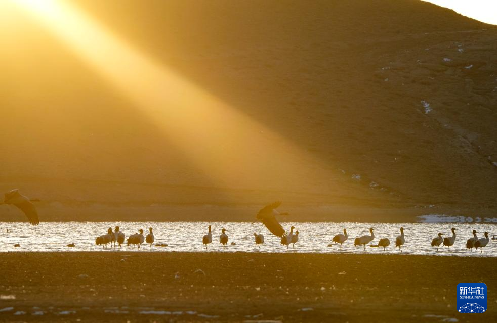 2月20日清晨,第一縷陽光照耀在西藏拉薩市林周縣越冬的黑頸鶴身上。新華社記者 晉美多吉 攝?
