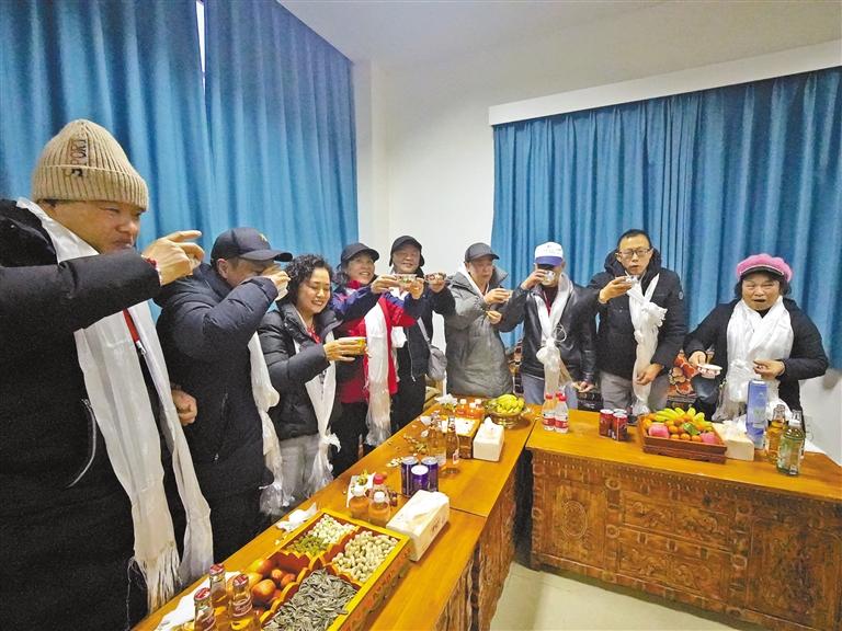 “古突”之夜,“走進(jìn)雪域邊陲 體驗(yàn)藏歷新年”旅游團(tuán)游客在玉麥以酥油茶代酒,祝賀藏歷新年,祝福祖國(guó)繁榮昌盛?! ?/p>