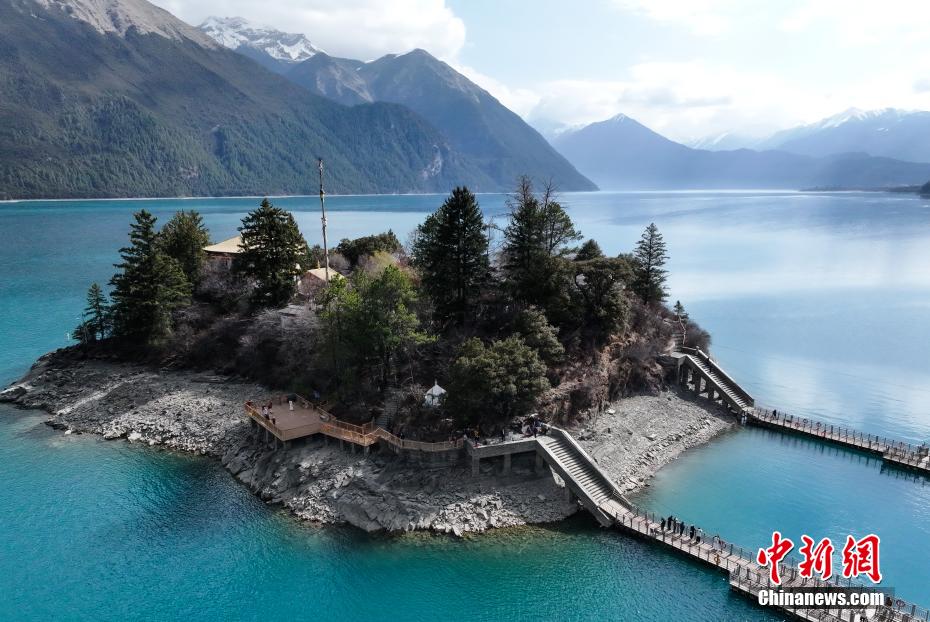 3月30日,航拍巴松措湖心島。巴松措又名錯(cuò)高湖,位于西藏自治區(qū)林芝市工布江達(dá)縣,是西藏首個(gè)自然風(fēng)景類國(guó)家5A級(jí)旅游風(fēng)景區(qū)。從空中俯瞰巴松措,碧藍(lán)的湖水被雪山、森林環(huán)繞,宛如鑲嵌在群山間的“藍(lán)寶石”。(無人機(jī)照片)中新社記者 馬銘言 攝