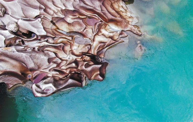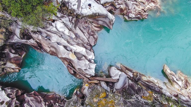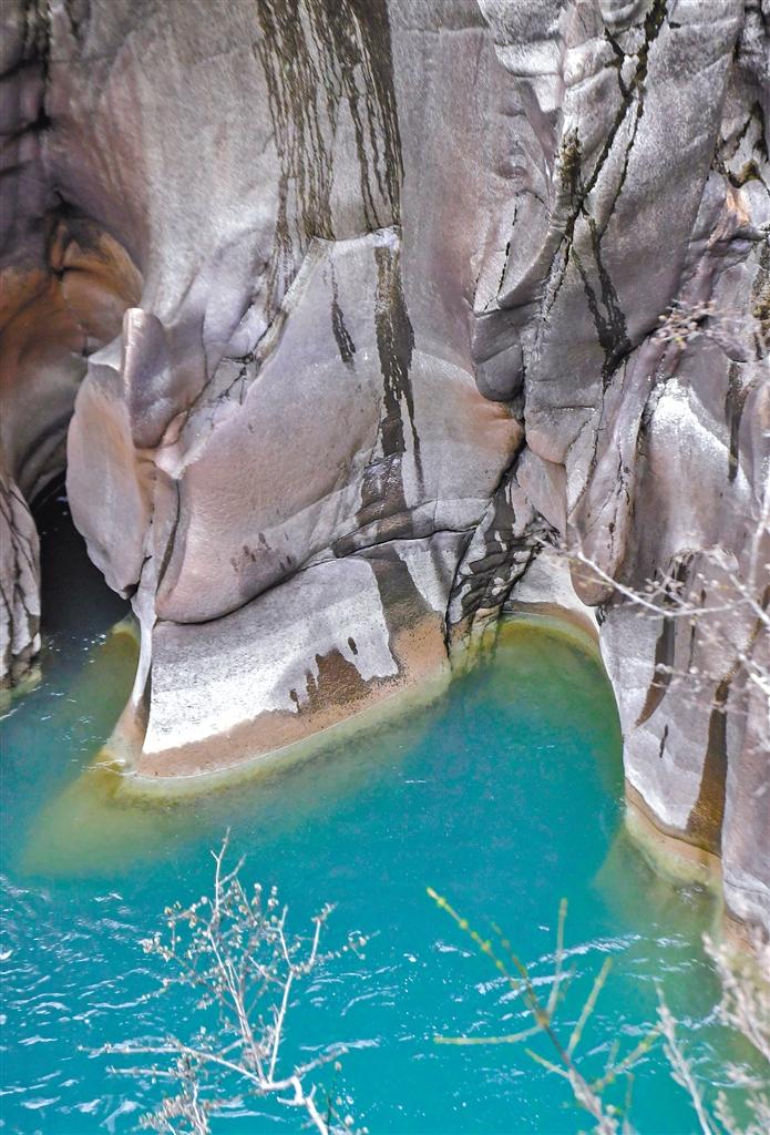 在丙察察公路接近察隅縣城的位置,國(guó)道219線與559線交匯點(diǎn),有一處由水流反復(fù)沖刷激蕩出的地質(zhì)奇觀——水磨巖。