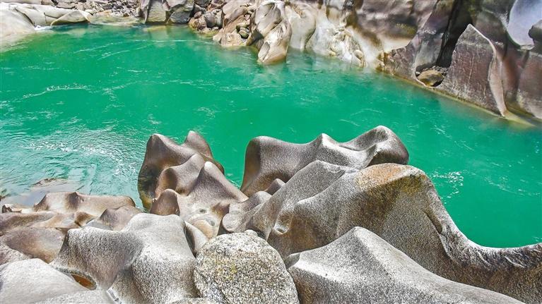 察隅縣千年水磨巖適合觀賞期在春、秋、冬三季的枯水期。此時(shí)水位下降、巖石露出,水色澄碧、怪石嶙峋,石頭似臥犀、似河馬、似龍爪、似漏斗、似波浪,形態(tài)多變,與森林、水流、高山懸崖相呼應(yīng),組合成難得一見的山水畫卷。
