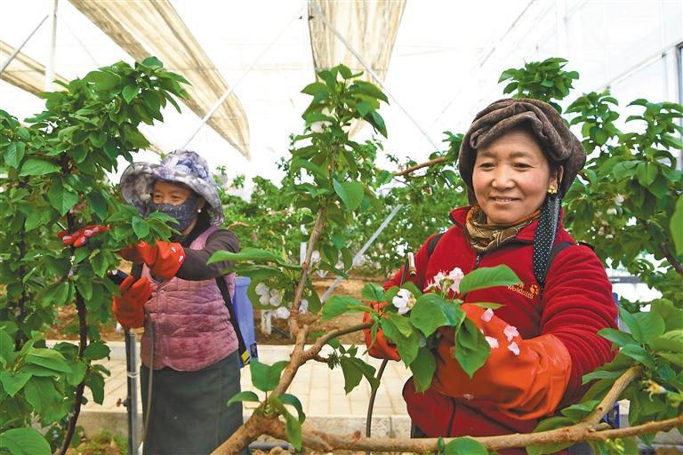 圖為拉薩市尼木縣吞彌現(xiàn)代農(nóng)業(yè)產(chǎn)業(yè)園櫻桃種植基地內(nèi),工人將配好的授粉劑噴灑在櫻桃花蕊上。記者 王敏 洛桑 攝