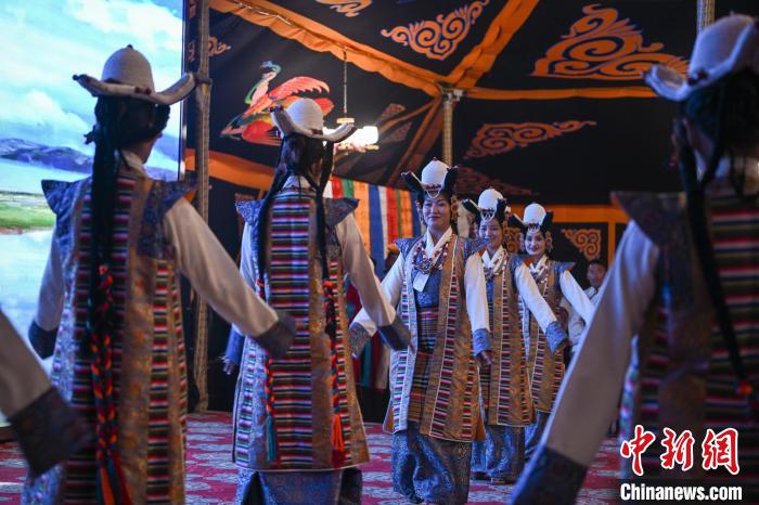 5月18日,西藏拉薩首屆“雪域古城·圣地拉薩”文化旅游節(jié)“情定當雄”篝火鍋莊晚會在當雄縣賽馬場熱鬧舉行?;顒娱_場,當雄縣盛大的迎賓儀式,盡顯藏族人民的熱情好客。隨后,拉薩各縣區(qū)帶來極具地方特色的文藝節(jié)目,舞蹈、歌曲等表演精彩紛呈,展現(xiàn)了拉薩多元文化魅力。傍晚,游客市民在賽馬場黑帳篷中觀看非遺展示,深入了解藏文化精髓。夜幕降臨,眾人圍在篝火旁跳起鍋莊,歡聲笑語回蕩在高原夜空。圖為當雄牧民手持哈達參加迎賓儀式。中新社記者 貢嘎來松 攝