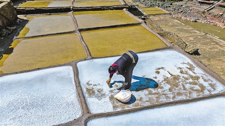 傳承千年的制鹽技術(shù),就是從鹽井汲取鹵水倒入貯鹵池存放5到6天,將貯鹵池中的鹵水灌注到鹽田中,依靠風(fēng)吹日曬析出鹽粒。而后,將結(jié)晶的鹽刮成弧形以充分脫水。每年的11月至次年6月為曬鹽季,其中3月到5月為旺季。收鹽的周期因氣候、地勢而異,平均3到5天收一次鹽。收鹽一般分兩道工序,第一道用薄木板或薄鐵片刮取最上層的鹽,這道鹽雜質(zhì)少,色澤干凈,為食用白鹽;第二道鹽因在刮取時會不可避免地混入泥土,無法食用,通常為養(yǎng)生紅鹽,也有部分會用于牲畜飼料制作。