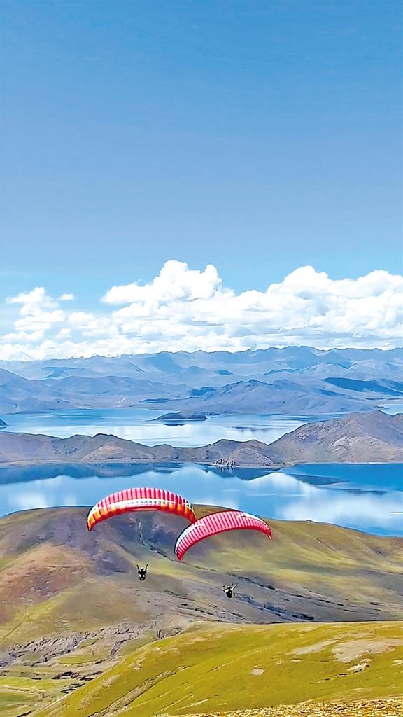 5月,午后的羊卓雍錯(cuò)(以下簡稱羊湖)別具魅力。在海拔大約5000米的山頂上,經(jīng)過一番準(zhǔn)備,來自深圳的游客朱先生跟隨教練口令向懸崖邊沖去?;鑲惚粴饬魍信e著騰空而起,劃出一道優(yōu)美的弧線,像雄鷹一樣翱翔在波光粼粼的湖面上,最后飄然降落在湖邊……