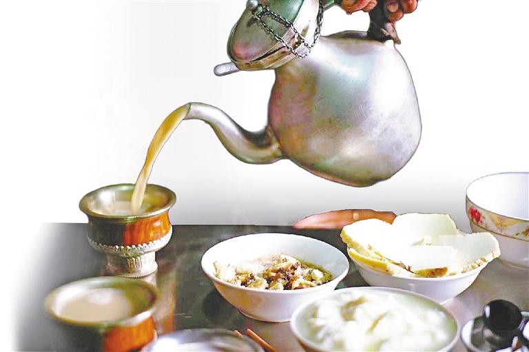 人們平常吃的早餐有粥、包子、豆?jié){、面條等,而在高原地區(qū),糌粑和酥油茶是當(dāng)?shù)厝说臓I(yíng)養(yǎng)早餐,也是藏族人餐桌上的必選。其中,酥油茶是為適應(yīng)高寒環(huán)境而創(chuàng)造的特色飲品。它是將牦牛奶提煉的酥油與磚茶湯混合,加入鹽調(diào)味制成的,口感濃郁醇厚。其高脂肪、高熱量的特性,既能抵御嚴(yán)寒,又可緩解高原缺氧帶來(lái)的疲勞,既是當(dāng)?shù)厝说脑绮?,也是日常生活中的必需品?/p>