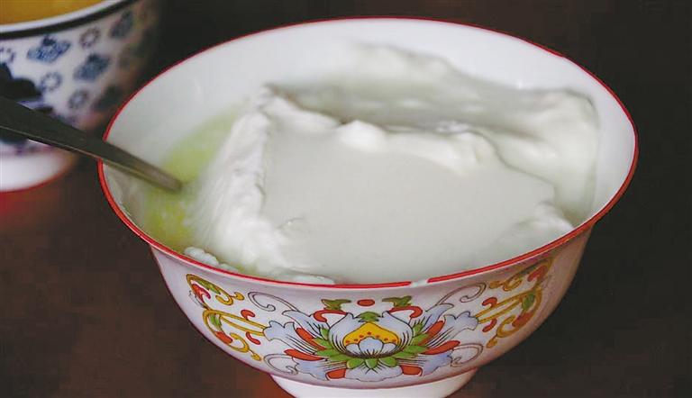除了常規(guī)的高蛋白大餐,西藏還有許多特色美食,酸奶拌飯便是夏日爽口美食之一。酸奶帶著牦牛奶獨(dú)特的鮮味,提煉后形如“豆腐腦”,白嫩滑溜,口感微酸與微甜交織,令人身心愉悅。在藏族世代延續(xù)的飲食文化中,酸奶拌飯因其豐富的營(yíng)養(yǎng)價(jià)值,深受人們喜愛(ài)。