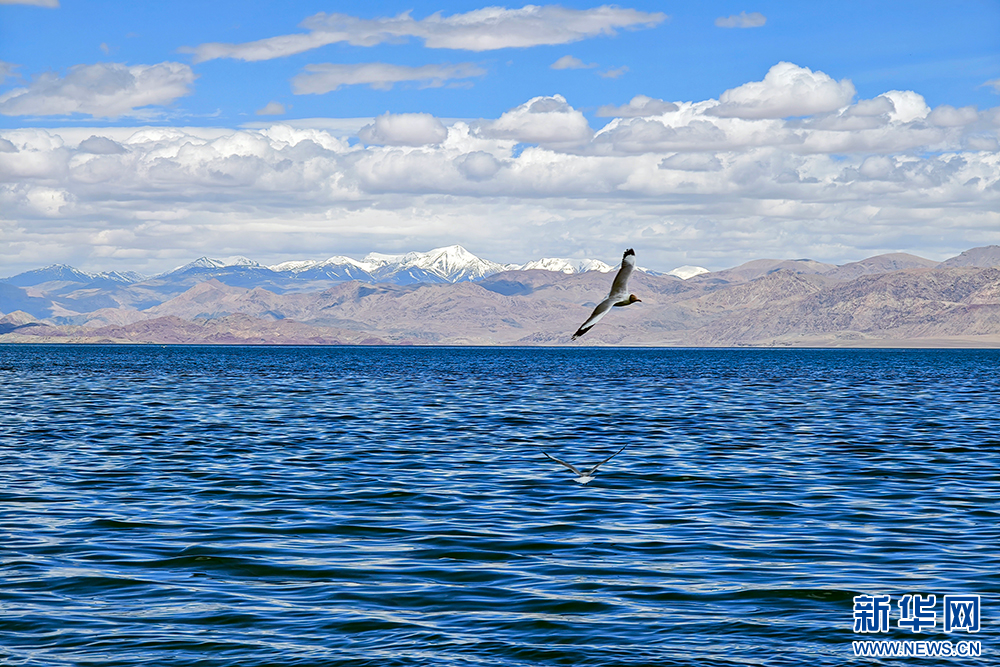 班公湖上飛翔的鳥兒(6月15日攝,無人機照片)。新華網 旦增努布 攝
