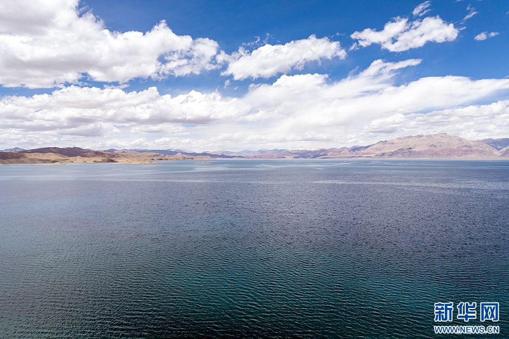 藍天白云映襯下的班公湖(6月15日攝,無人機照片)。新華網 旦增努布 攝