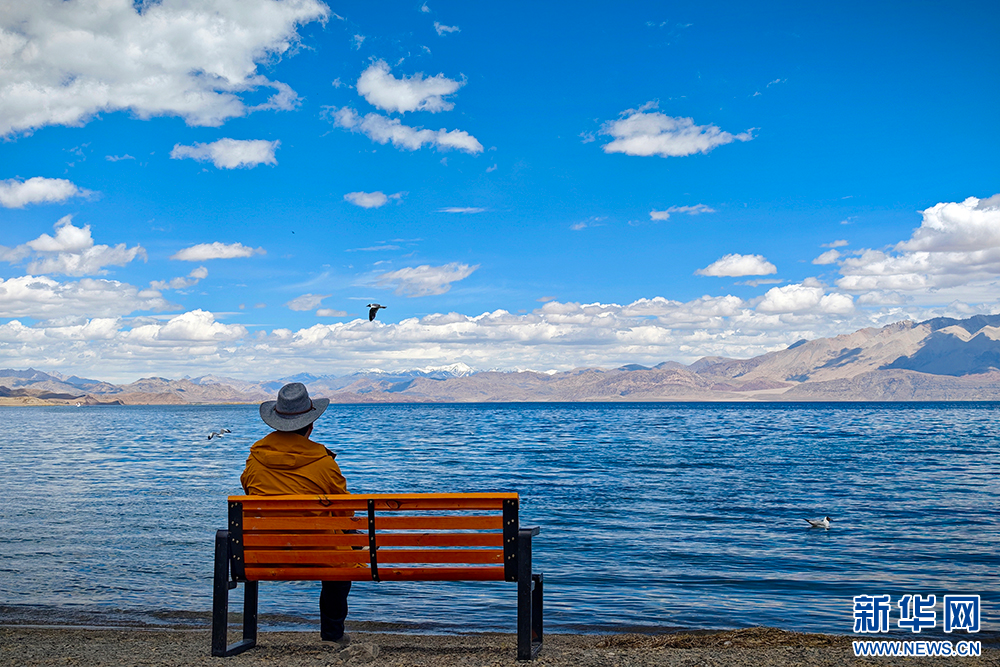 游客在班公湖邊欣賞美景(6月15日攝)。新華網 旦增努布 攝