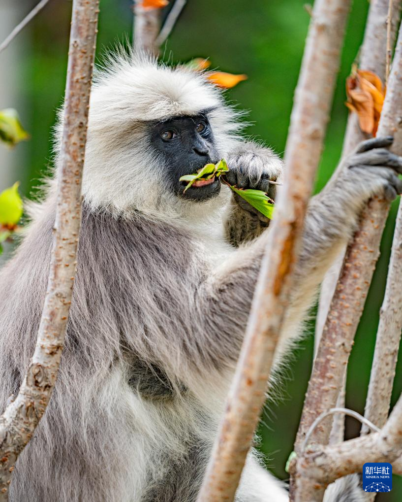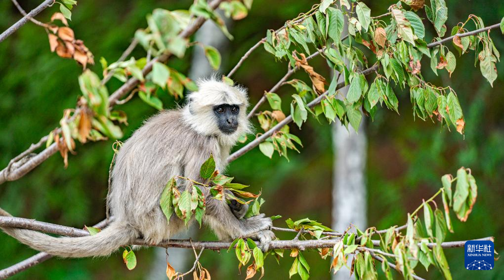 6月20日,在日喀則市亞東縣,一只長尾葉猴在吃樹葉。新華社記者 丁增尼達(dá) 攝 ??