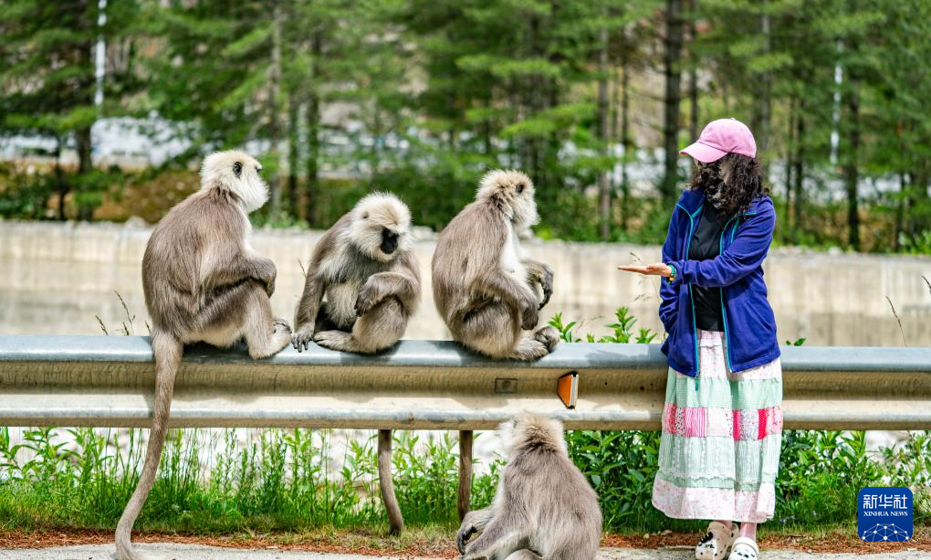 6月20日,在亞東縣一條公路邊,游客在和長尾葉猴互動(dòng)。新華社記者 丁增尼達(dá) 攝 ??