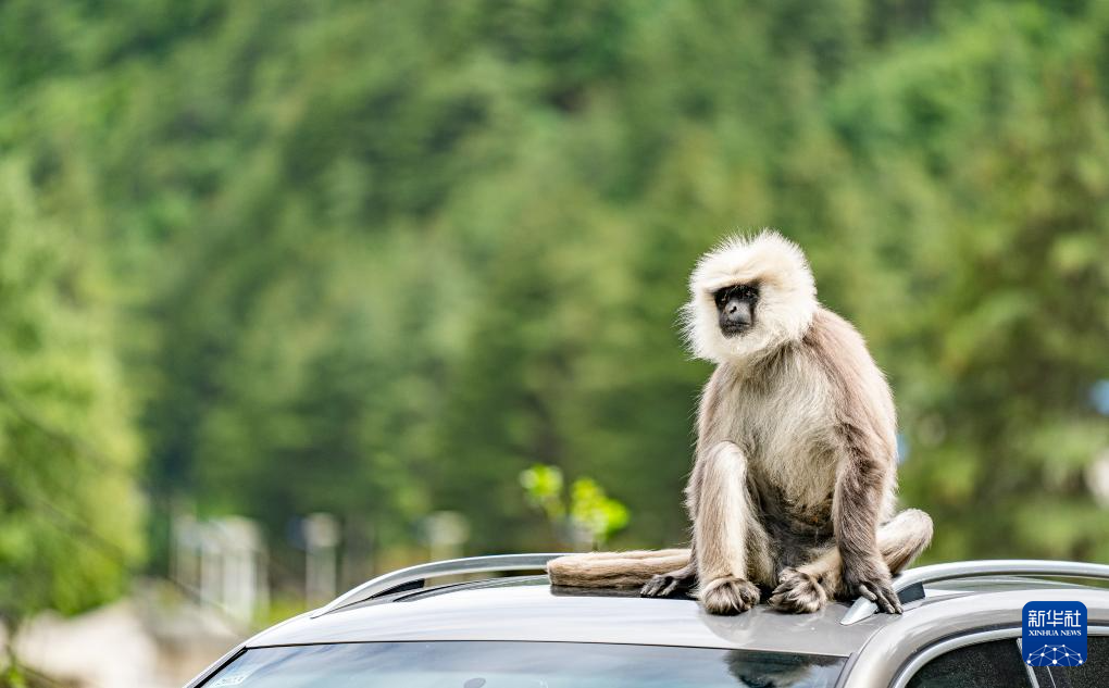 6月20日,在亞東縣一條公路邊,一只長尾葉猴蹲坐在車頂休息觀望。新華社記者 丁增尼達(dá) 攝
