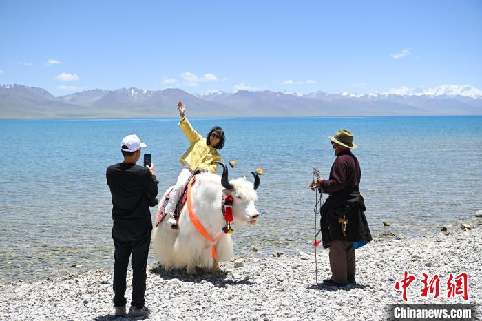 6月26日,隨著氣溫逐漸升高,西藏納木錯迎來旅游旺季。納木錯,藏語意為“天湖”,位于西藏自治區(qū)中部,拉薩市當雄縣和那曲市班戈縣之間,面積超2000平方公里,湖面海拔4718米,是世界海拔最高的大型咸水湖。圖為游客在納木錯湖邊拍照留念。中新社記者 貢嘎來松 攝