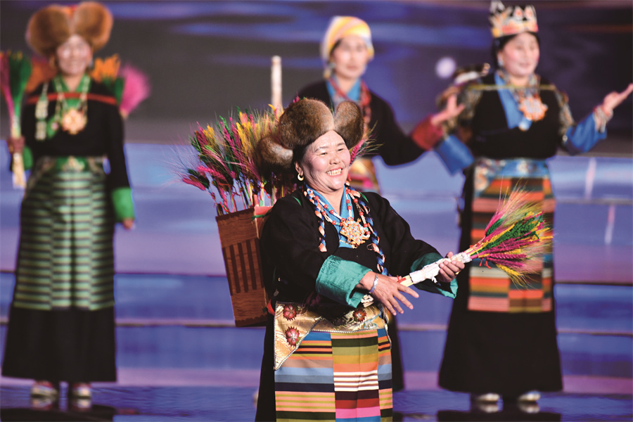 在拉薩市2026年春節(jié)藏歷火馬新年聯(lián)歡會現(xiàn)場,阿佳央金和農(nóng)牧民婦女一起帶來了“村T”走秀。趙振宇 攝