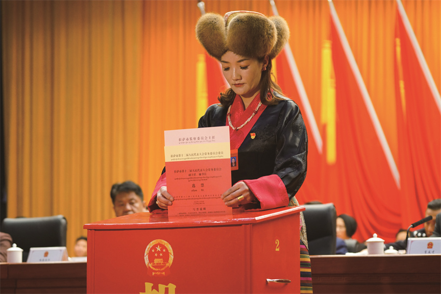 在拉薩市兩會(huì)上,人大代表投下神圣的一票,行使當(dāng)家作主的權(quán)利。趙振宇 攝