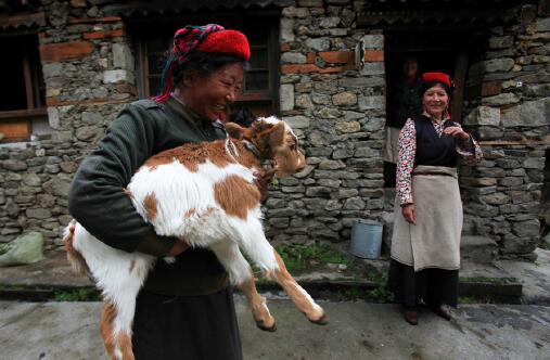 次仁央宗(右)是“薩瑪酒歌”的傳承人,這項門巴族的傳統(tǒng)藝術已經(jīng)成為國家級非物質(zhì)文化遺產(chǎn)?,F(xiàn)在她正在村里修建灌渠的施工隊里打短工,一天可以掙一百元,此時被村長叫回家接受了我們的采訪。(攝影/ 邱衍慶)