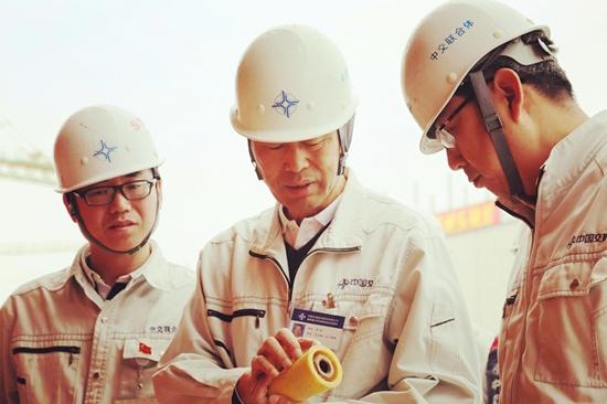 港珠澳大橋島隧工程項(xiàng)目總經(jīng)理兼總工程師林鳴與同事一起討論施工細(xì)節(jié)。(圖片來源:新華視點(diǎn))