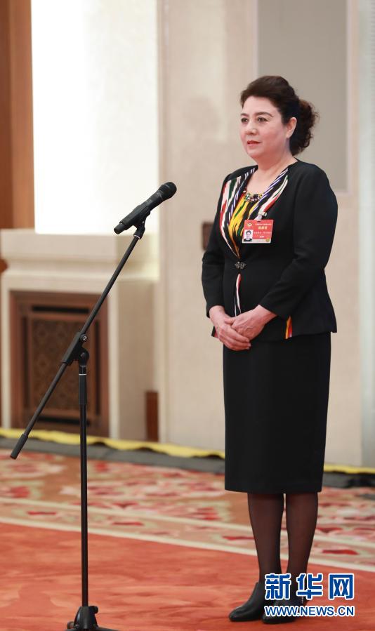 3月10日,全國政協(xié)十三屆四次會(huì)議第三場“委員通道”采訪活動(dòng)在北京人民大會(huì)堂新聞發(fā)布廳舉行。這是全國政協(xié)委員古麗帕麗·阿不都拉通過網(wǎng)絡(luò)視頻方式接受媒體采訪。新華社記者 王南 攝