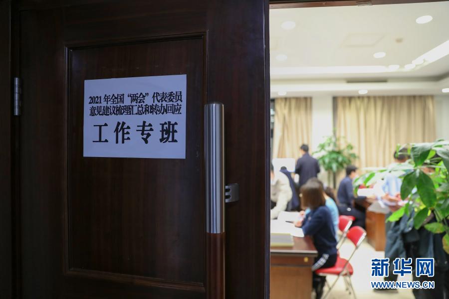 3月5日,2021年全國(guó)兩會(huì)代表委員意見建議梳理匯總和轉(zhuǎn)辦回應(yīng)工作專班的工作人員在忙碌。新華社記者 李木子 攝