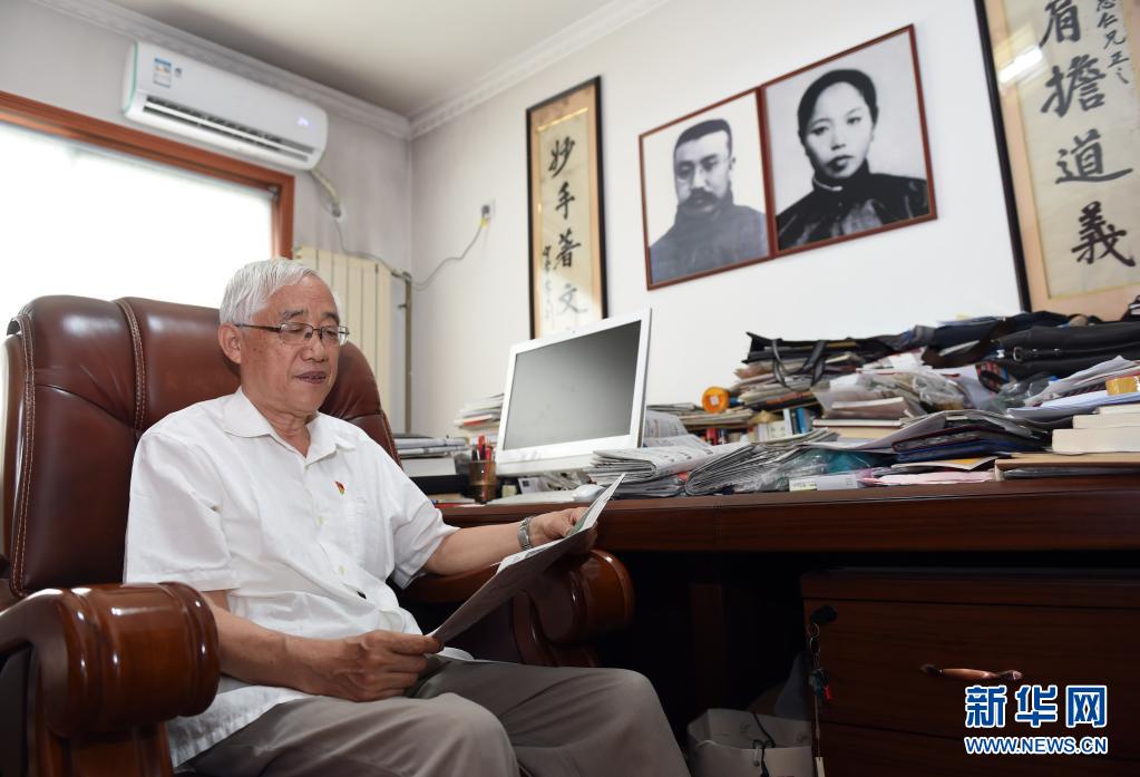 6月12日,李宏塔在家中書(shū)房讀書(shū),墻上掛著祖父李大釗和祖母趙紉蘭的相片。新華社記者 周牧 攝