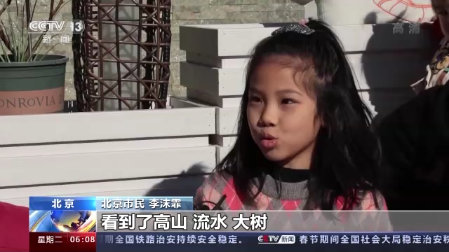 北京市民 李沫霏:看到了高山、流水、大樹(shù),在家里只有爸爸、媽媽、爺爺、奶奶和妹妹陪我過(guò)年,在這有大家一起過(guò)年了,人多了,更有那種開(kāi)心的感覺(jué)。