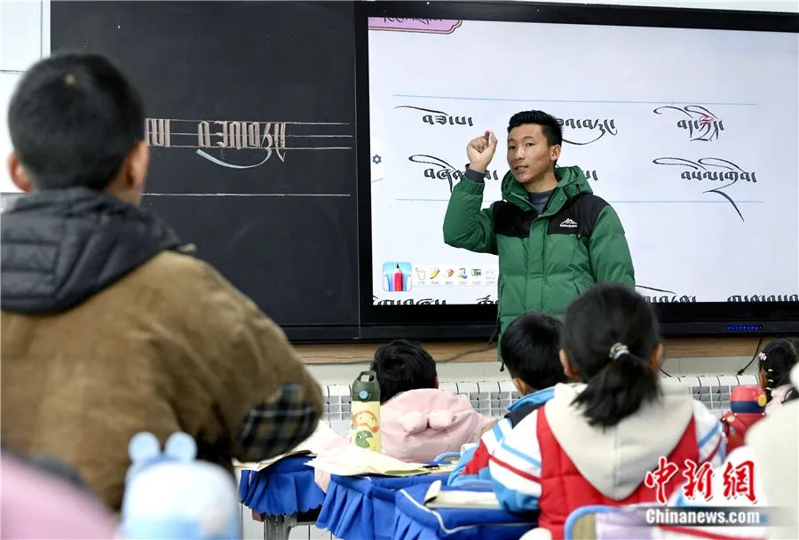 2023年3月14日,西藏拉薩市第一小學(xué)藏語文老師拉巴次仁在課堂提問。李林 攝