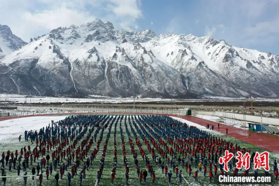 西藏嘉黎縣中學(xué)學(xué)生在操場做操。貢嘎來松 攝